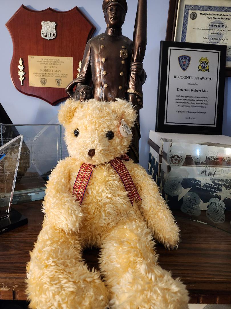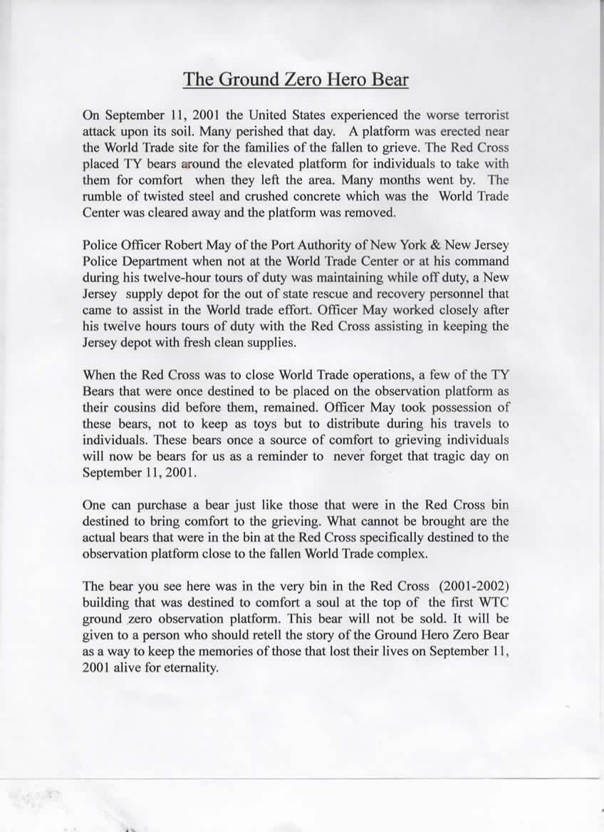 This bear is almost 25 years old. It is one of the very few remaining from the Red Cross bin. These ambassadors are a reminder to those that we must never forget all those lost on September 11th , 2001. The cousins of this bear are in New York, New Jersey, California, Florida, Louisiana, Boston and Washington DC. They are cared for by people who know the value and message these bears represent. They are placed in special places within their office or homes. A month ago, I was privileged to give a Ground Zero Hero Bear for the year 2025 to a hero in your own right. A registered nurse, Casey S., who has worked in a special pediatric unit (NICU) for infant babies working hard to survive in the new world they were born in. Casey has a special place for the Ground Zero Hero Bear to ensure people inquire about the bear and what it stands for.